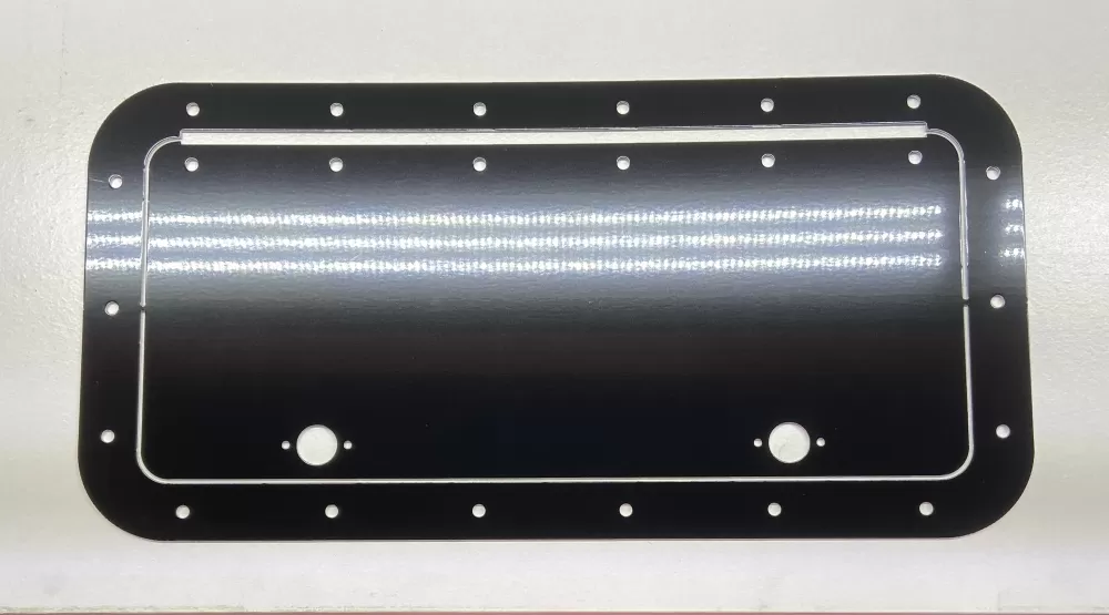 14" long by 6" wide gloss black aluminum access door and frame. It comes with dzus springs and captivated dzus buttons as well as the hinge. This access door and frame come with a protective film for installation.