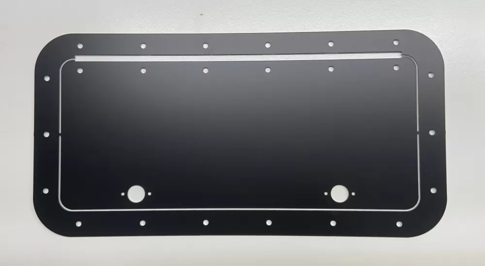 14" long by 6" wide flat black aluminum access door and frame. It comes with dzus springs and captivated dzus buttons as well as the hinge. This access door and frame come with a protective film for installation.