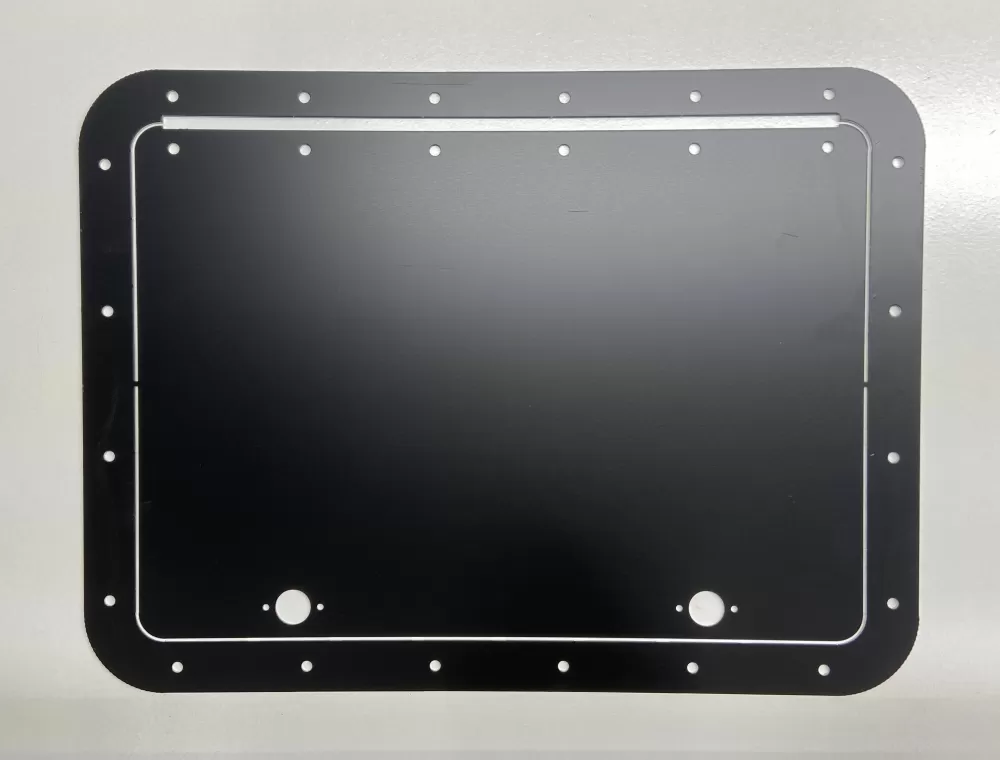14" long by 10" wide flat black aluminum access door and frame. It comes with dzus springs and captivated dzus buttons as well as the hinge. This access door and frame come with a protective film for installation.