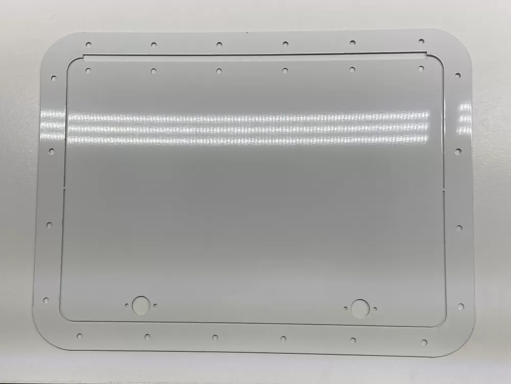 14" long by 10" wide white aluminum access door and frame. It comes with dzus springs and captivated dzus buttons as well as the hinge. This access door and frame come with a protective film for installation.