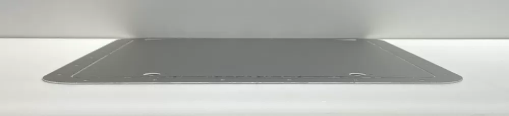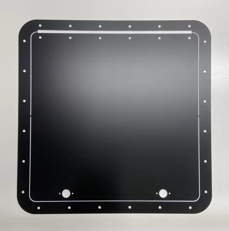 14" long by 14" wide flat black aluminum access door and frame. It comes with dzus springs and captivated dzus buttons as well as the hinge. This access door and frame come with a protective film for installation.