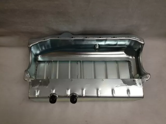 This steel dry sump oil pan is for the Small Block Chevrolet years 1957-1985 with the two piece rear main seal engines. This oil pan features: