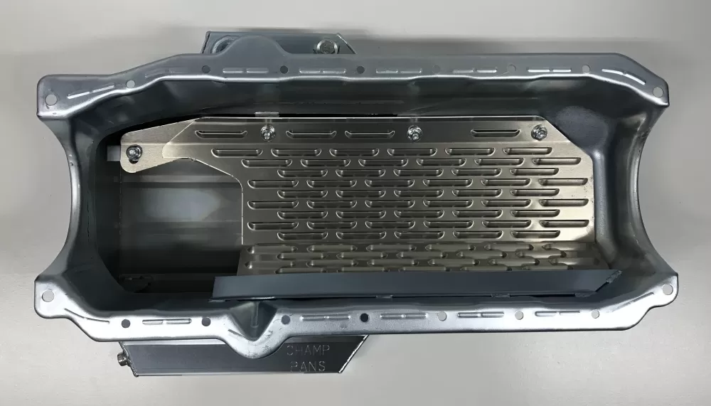 This oil pan is designed around the Chevrolet Camaro front stub with the engine set back.