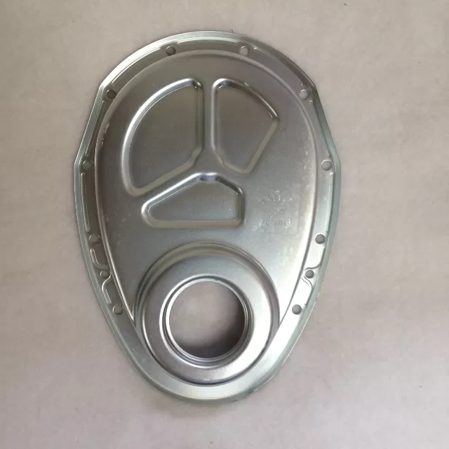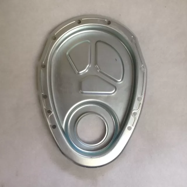 GM-style timing cover in silver for the Small Block Chevrolet years 1957-1974. This timing cover features: