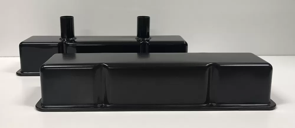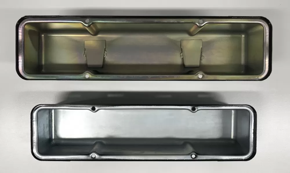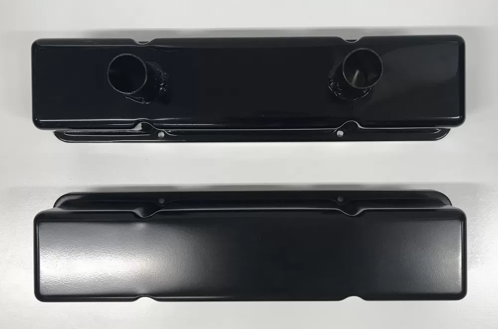 Stamped steel valve cover set for the Small Block Chevrolet. This valve cover set features: