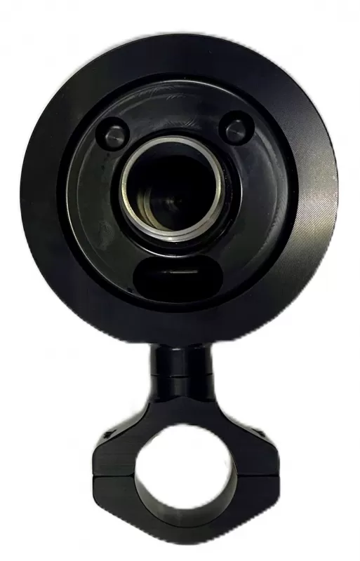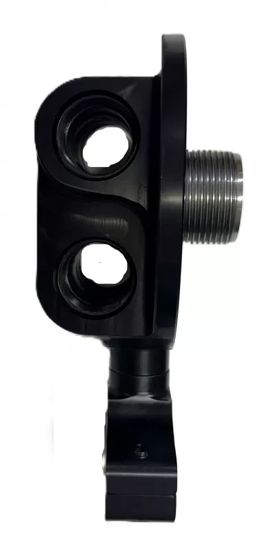 Remote oil filter mount that is anodized black. Thread is 1 1/2"-12 threads per inch with #12 o-ring in/out ports.