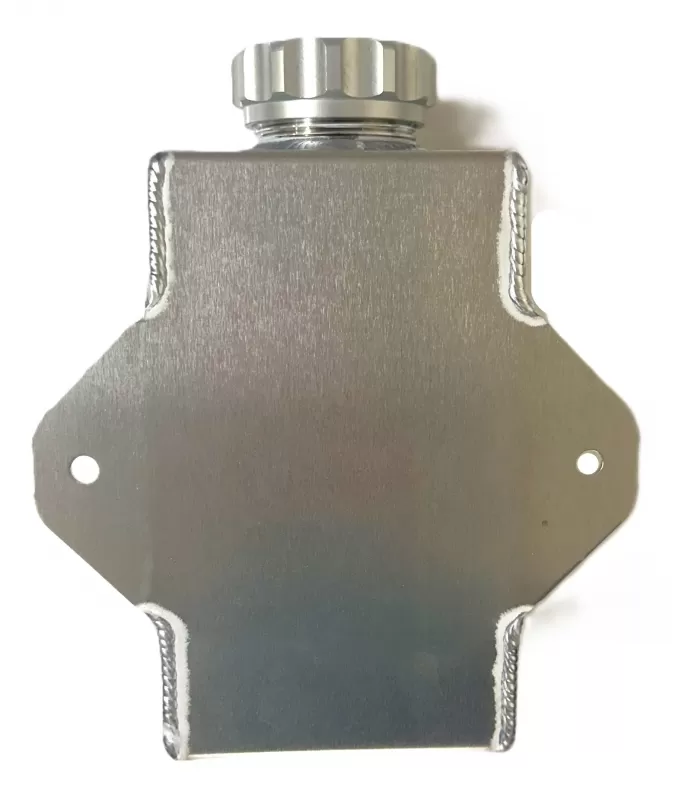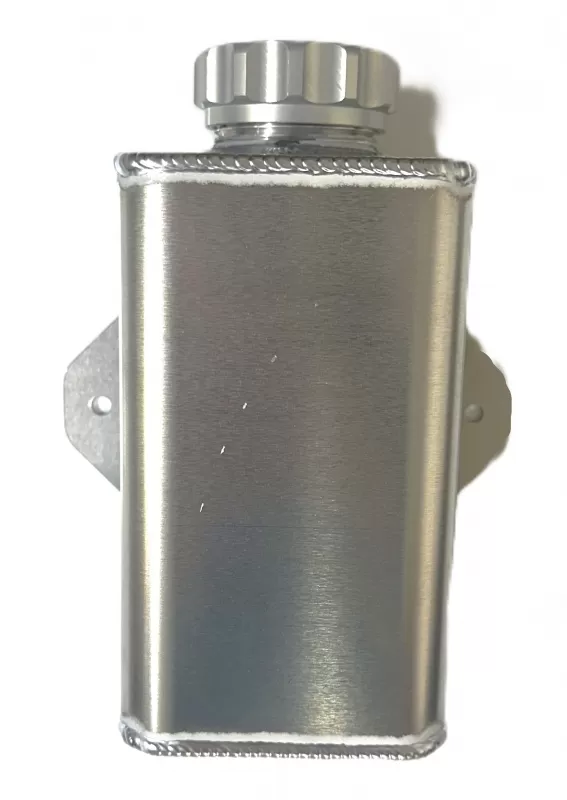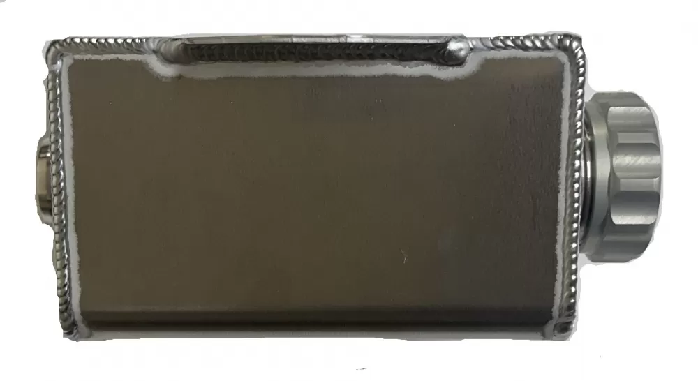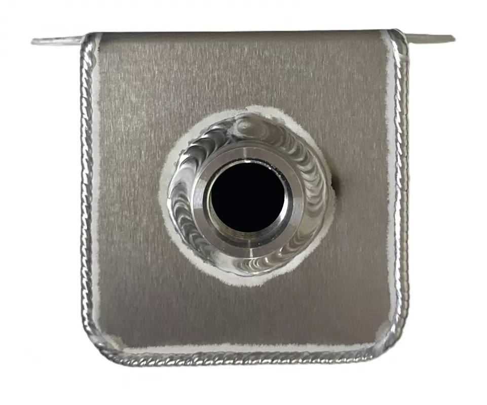 Aluminum fluid filler tank with 25 oz capacity and female -12 an fitting on bottom.