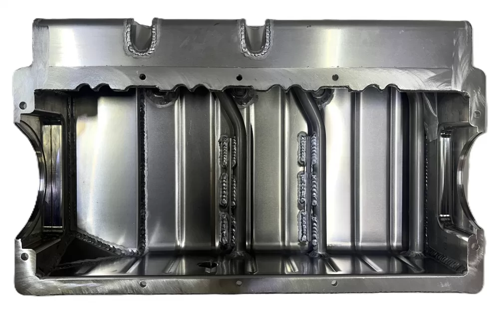 This aluminum dry sump oil pan is for the Dart Small Block Chevrolet engines with the spread rails. This oil pan features: